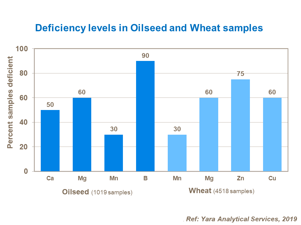 The appropriateness of the Crop Specific products can also be assessed against nutrient deficiency data. If historical, individual farm / field data is available then this can be used. Alternatively, large data sets from national analytical services can be valuable sources of information. Yara Analytical Services deficiency data shows the following: