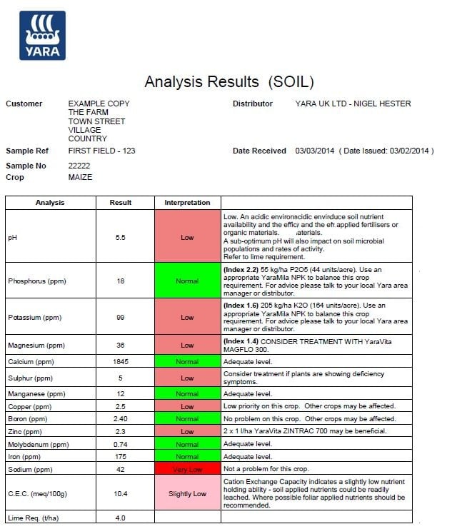 The a broad spectrum soil analysis provides information on: P, K, Ca, Mg, S, B, Cu, Fe, Mn, Mo, Zn, Na, CEC, pH and gives a lime recommendation.