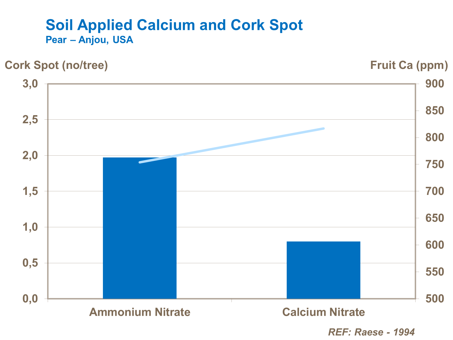 Both foliar and soil-applied forms of calcium have an effect on cork spot and alfalfa greening and it is widely accepted that the N:Ca ratio needs to be maintained at 6 or below in order to minimize alfalfa greening in pears.