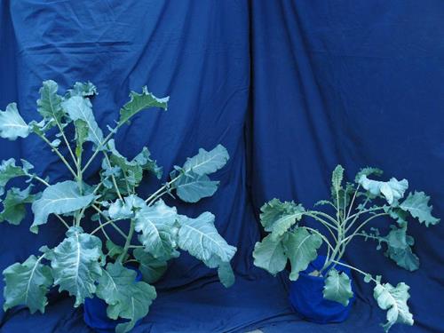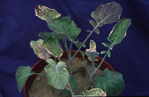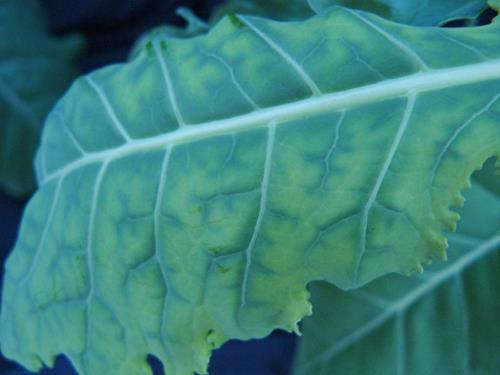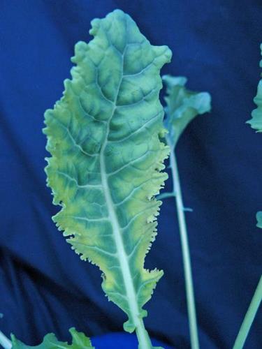 Chlorosis starts in young leaves and proceeds to the older leaves with ongoing deficiency. First leaves show chlorosis in the intercostal fields, later on they are uniformly light green or yellow. Frequently, brassica crops develop longer leaf stems and narrow spoon-like malformed leaves.