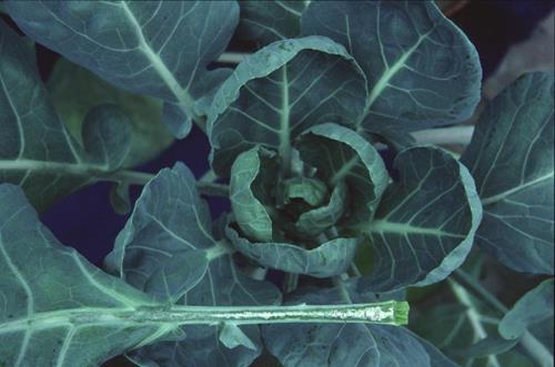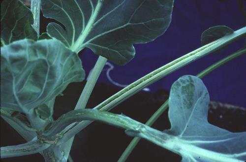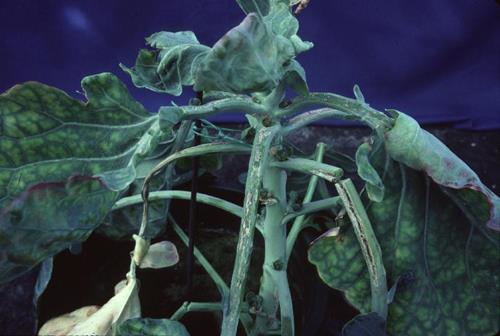 Boron deficiency leads to scarred and corky spots on petioles and stems. Leaves are brittle and deformed. Petioles may show cracks or become hollow.