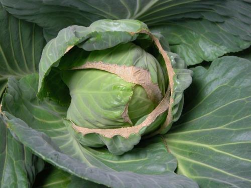 The margins of the upper leaves of the cabbage head become necrotic brown, being sharply delimited towards healthy tissue.