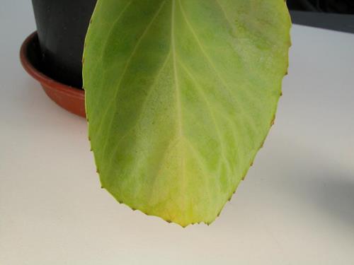 With nitrogen deficiency the foliage becomes uniformly yellowish-green (chlorotic), some leaf parts may show a reddish or orange flush.