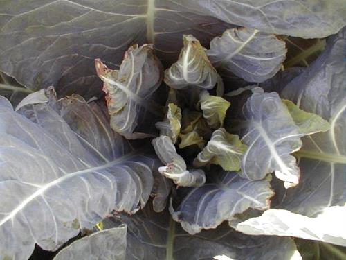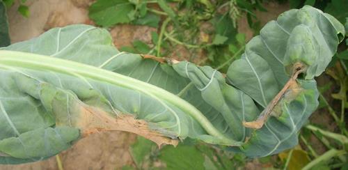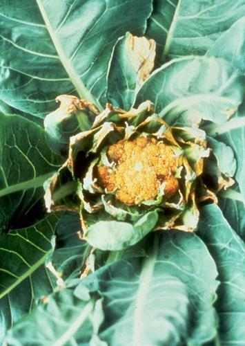 Necrotic leaf margins and "clawlike" deformations at the youngest leaves. The curd dies off.