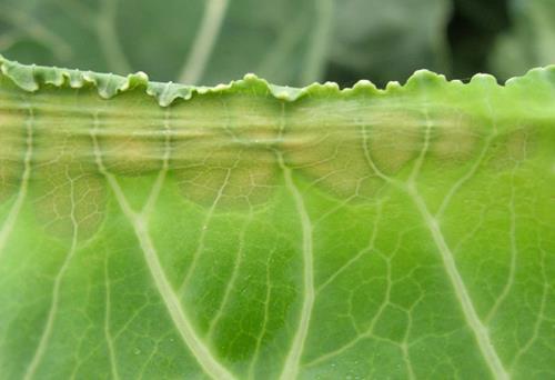 They develop necrotic lesions on leaf tips and margins ( "tip-burn"). With ongoing Ca-deficiency necrotic areas and a chlorotic border progress from tips and margins inwards.