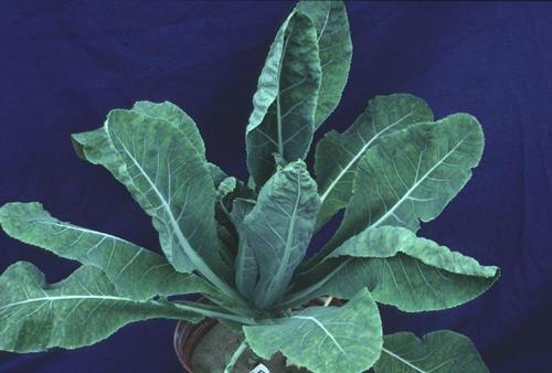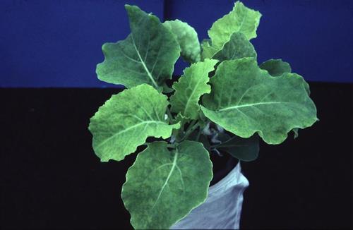 Interveinal fields of younger leaves brighten whereas the veins remain green. With ongoing deficiency youngest leaves turn completely yellow.