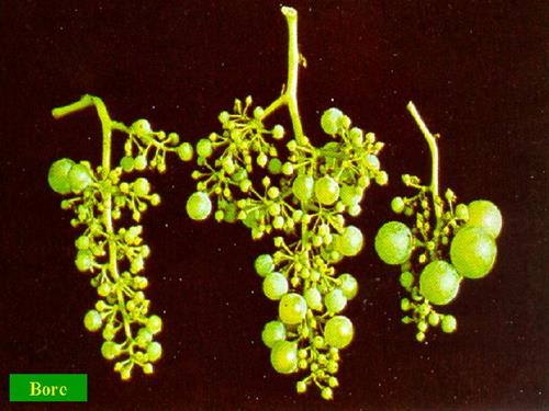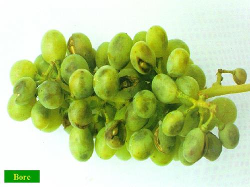 Boron deficiency is one of the most serious nonparasitic grapevine diseases. It is observed especially on strongly acid soils (pH 3.5 - 4.5).