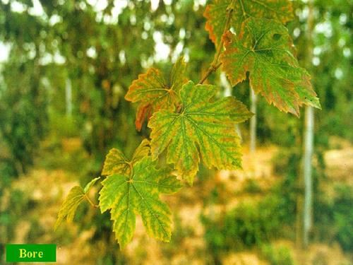 Boron deficiency symptoms on the leaves appear first as chlorosis on leaf margins. Chlorosis extends between the veins.