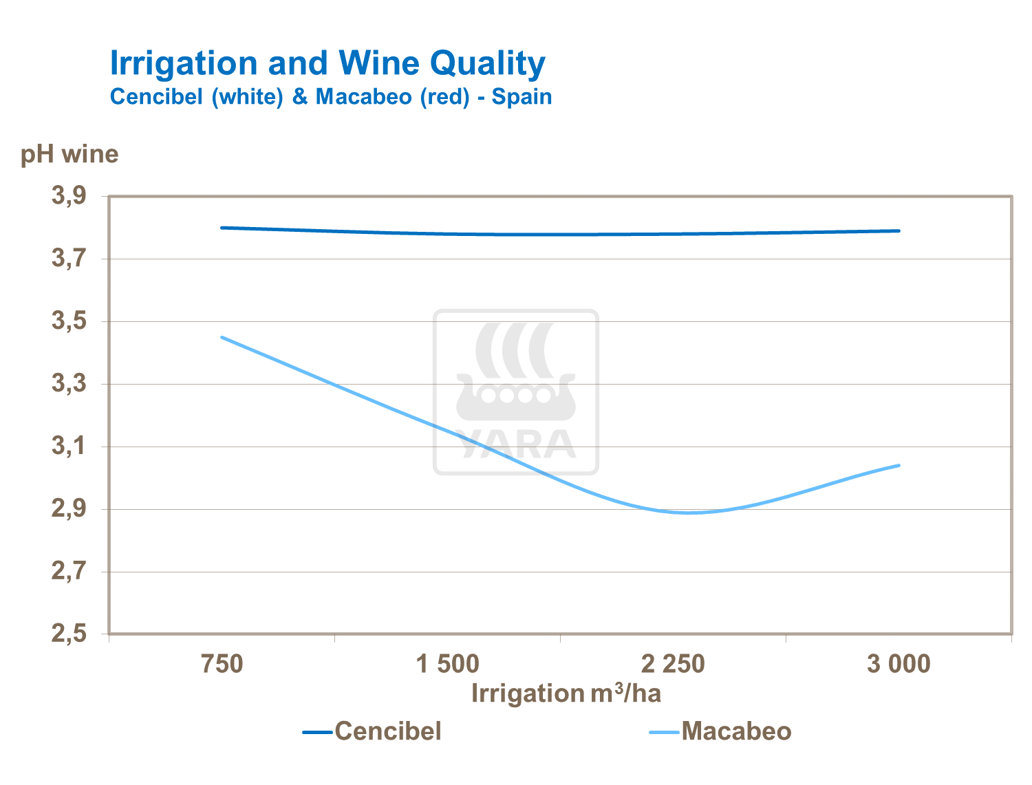 In the same Spanish trials, irrigation had no effect on °Baumé in white grapes, but reduced °Baumé in red wine grapes. The pH of the wine was also reduced, but there was no effect on wine color. Recent trials by Yara Iberia have shown similar effects.