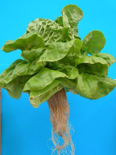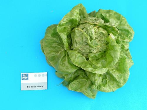 Generally iron deficiency does not decrease growth of lettuce. Only inner leaves are affected, because symptoms of iron deficiency always start on youngest leaves. They show yellow green, later lemon yellow and pale yellow interveinal chlorosis. Main veins still remain green. With strong deficiency veins become chlorotic, too and necrotic areas appear near leaf margin.
