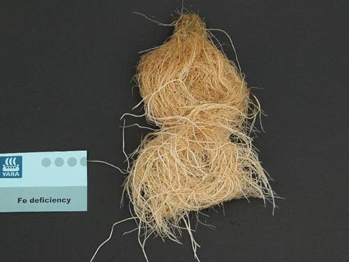 With iron deficiency roots are shorter than normal. They show brownish discoloration. Furthermore very many secondary roots arise.