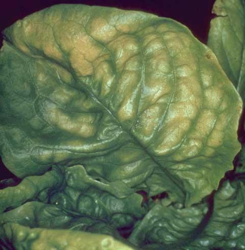 At prolonged deficiency yellow zones become necrotic, but veins still remain green.