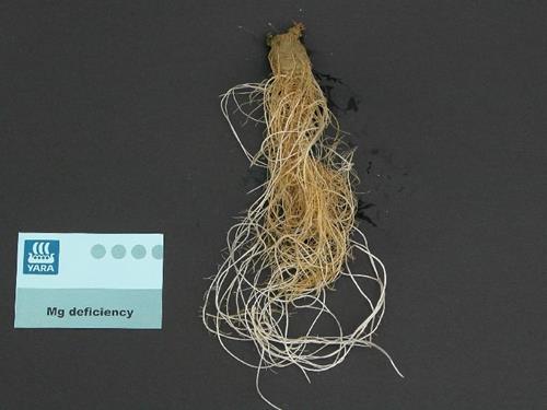 With magnesium deficiency roots are long, partly brownish in color and only few secondary roots are found.