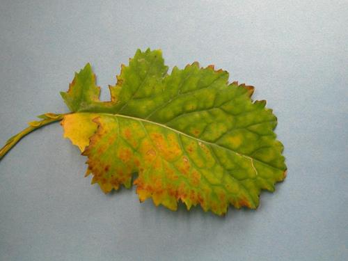 Magnesium deficiency always shows initially on the older leaves. Chlorosis develops between the veins, while a narrow area on each side of the veins remains green. The leaf margins - and with proceeding deficiency also the intercostal areas - become necrotic.