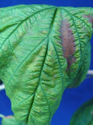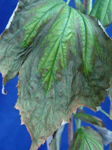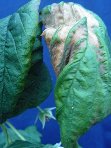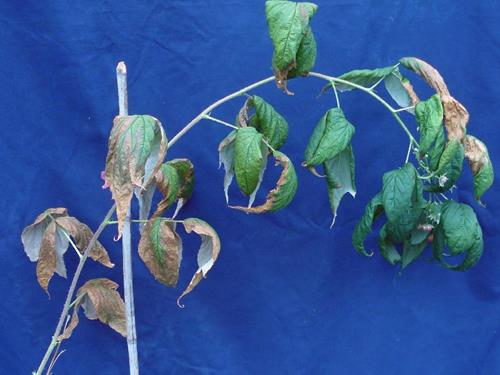 Dark green coloration of medium and young foliage. Wilting and leaf scorch starting from marginal and interveinal areas of older leaves. Poor branching. Reduced flowering and fruit set, worse fruit quality.