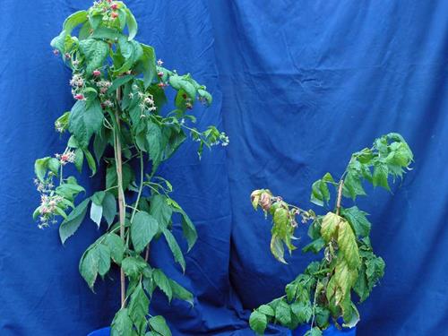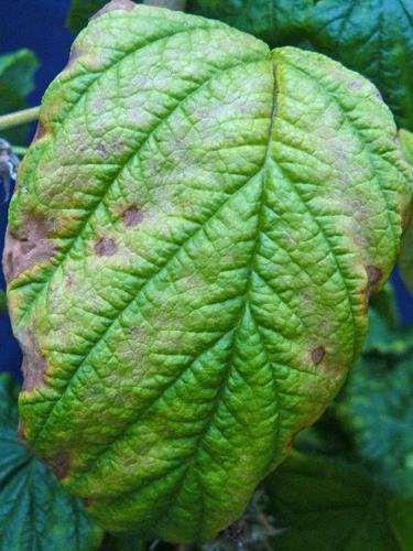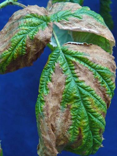 Raspberries have a relatively high demand of Potassium. An imbalanced nutrient supply with K, Mg and Ca may induce K deficiency. Its availibility can be restricted in clay soils.
