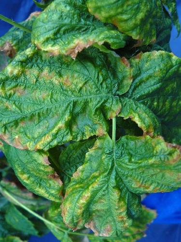 Interveinal yellowing and subsequent leaf scorch starting from mature leaves. Severely stunted growth.