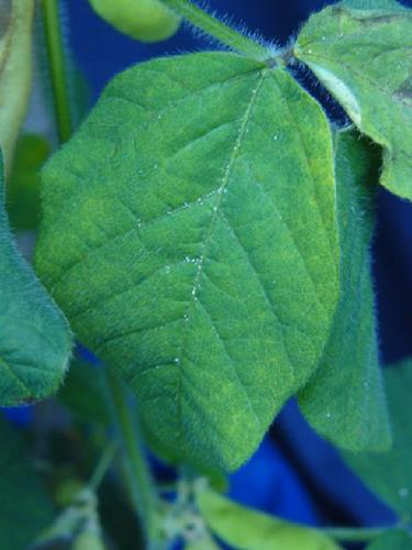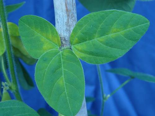 Iron deficiency symptoms on soybean are interveinal chlorosis of the upper, new leaves. With progressing deficiency, the complete leaf including the veins turns yellow to white. Brown or whitish necrotic spots may occur near the leaf edge.