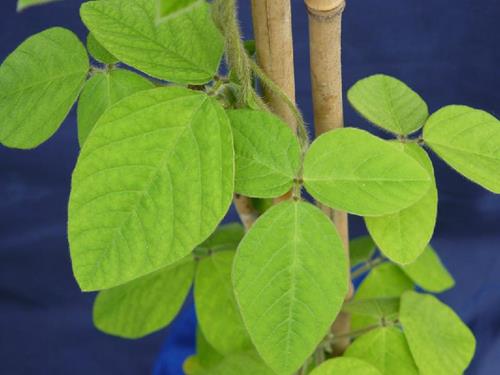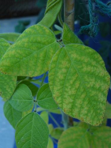 Nitrogen deficiency symptoms on soybean vary: the characteristical chlorosis may appear uniformly allover the leaf blade, but can also spread within the interveinal areas.