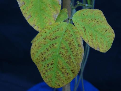 Nitrogen deficiency symptoms on soybean vary: the characteristical chlorosis may appear uniformly allover the leaf blade, but can also spread within the interveinal areas. Necrotic spots become visible on the leaf margin.