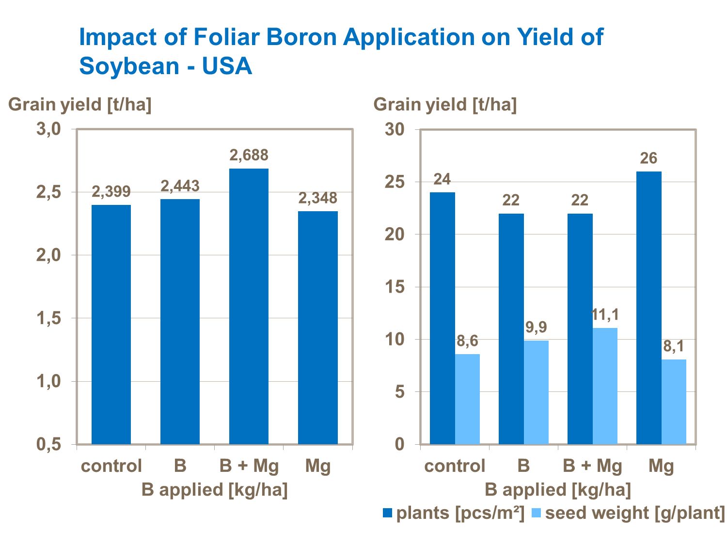 Boron deficiency causes malformation of the pollen tube and results in increase on flower abortion, then reducing soybean yield potential. Therefore, boron supply is essential to obtain high yields.