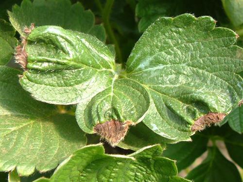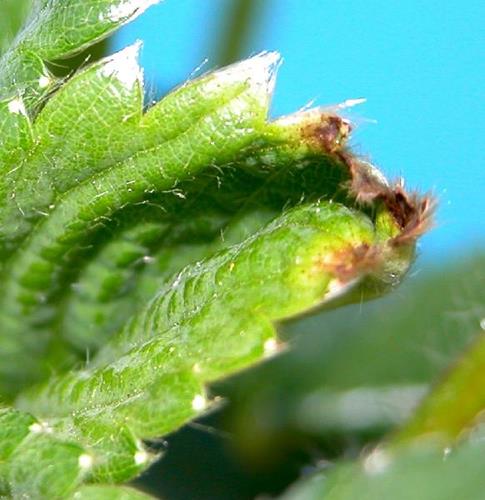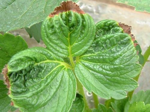 Young leaf with necrotic tips. The leaf blade is crinkled.