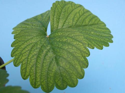First the young, immature leaves show a uniform light-green colour. Later interveinal areas become very light green with veins remaining green. With severe deficiency interveinal areas and veins bleach exept for a broad green border at the leaf margin