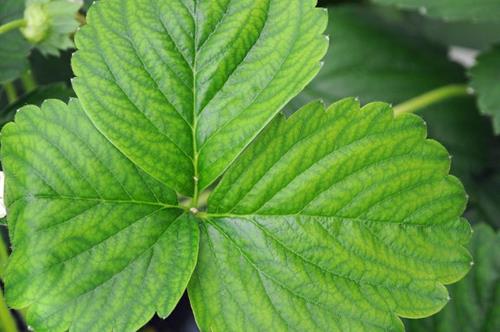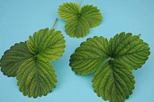 Chlorosis of young leaves with veins remaining green. Leaves become more chlorotic and bleached as deficiency worsens.