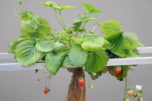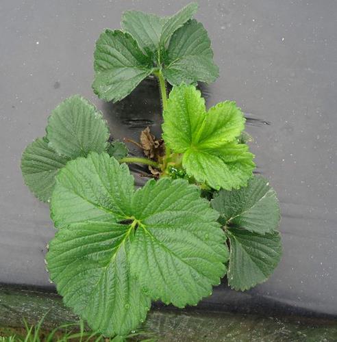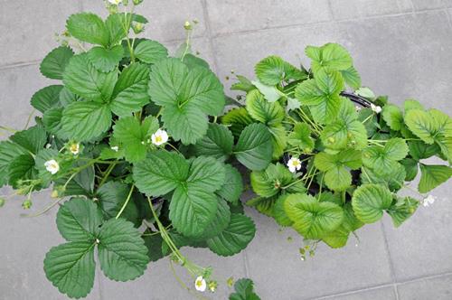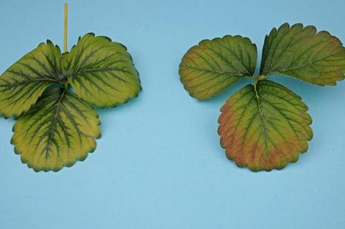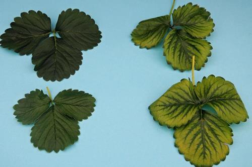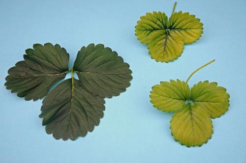 Zinc undersupply causes chlorosis on both younger and older leaves. Veins and the serrated leaf margins remain green.