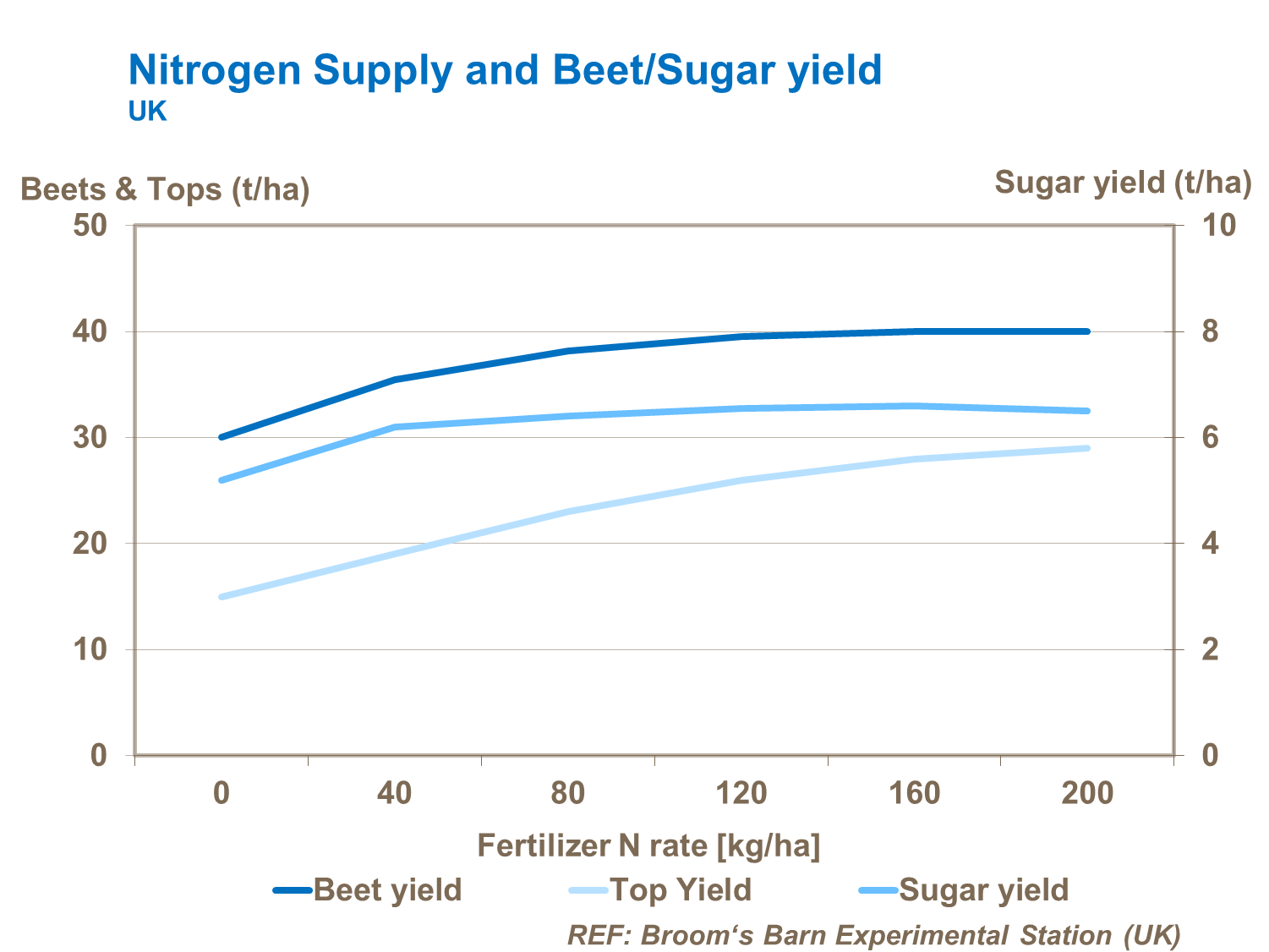 A typical optimum nitrogen rate for beet yield is approximately 120 kgN/ha.