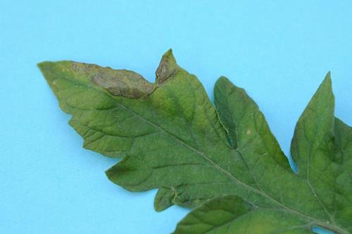 Additionally, starting from the leaf margin, chlorotic and subsequently necrotic areas progress. The necroses may have a brown or a dull, dark olive, colour.